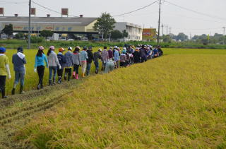 稲刈り体験 田柄小米作り体験 H24年度 2012.09.20 9月20日、田柄小学校の稲刈り体験を行いました。 約半分を生徒の皆さんに鎌で稲刈りしてもらい、 残りはコンバインでの稲刈りの様子を見学してもらいました。 残暑厳しい中での作業となり大変だったと思いますが、皆さん頑張っていました。 今年も東松山農林振興センターの遠藤さん、 練馬の農家吉田さんのご協力で怪我もなく無事に体験学習を終えることができました。